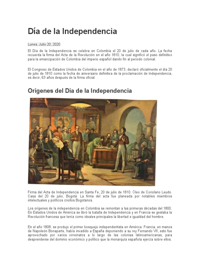 Aquí se da una lista con los países que celebran oficialmente el día de la independencia, con la respectiva fecha de cada uno y el evento que lo inspira. El día de la independencia argentina se celebra el 9 de julio de cada año. Este 20 de julio se celebra el día de la independencia de colombia. Aunque la historia va desde julio de 1810 hasta agosto de 1819, varias leyes a través de los años han dejado clara esta fecha como el día de la independencia nacional. Origen de la declaración de.